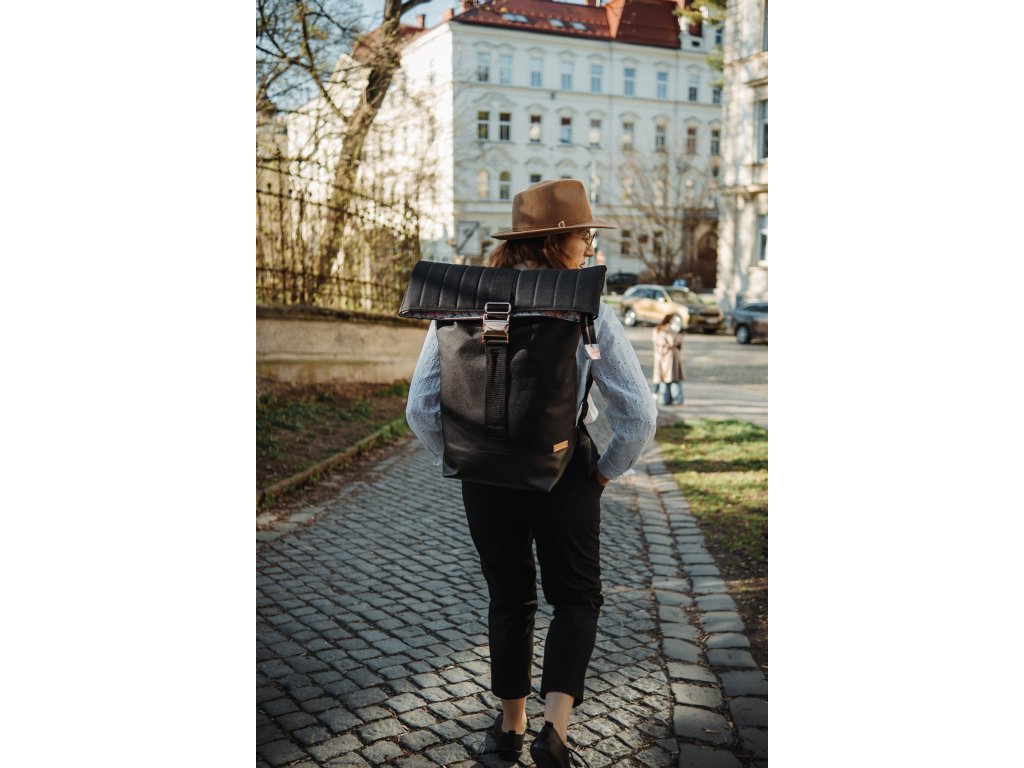 Černý rolovací batoh, je poctivě ušitý z nepromokavé látky a koženky. Vnitřní kapsy batohu jsou ze 100% bavlny. Celkový vzhled batohu je umocněný kováním v barvě růžového zlata. Na rozdíl od jiných batohů, se zapíná pomocí velkého kovového trojzubce.