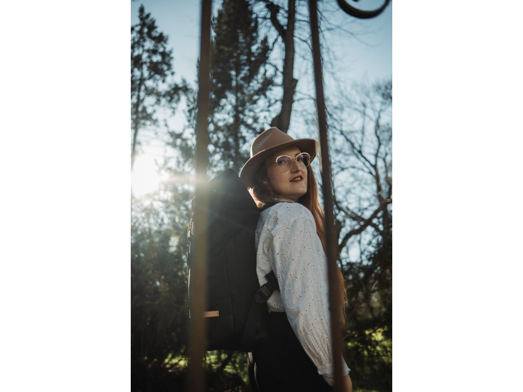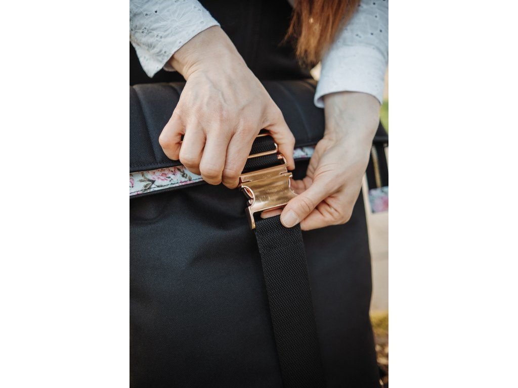 Černý rolovací batoh, je poctivě ušitý z nepromokavé látky a koženky. Vnitřní kapsy batohu jsou ze 100% bavlny. Celkový vzhled batohu je umocněný kováním v barvě růžového zlata. Na rozdíl od jiných batohů, se zapíná pomocí velkého kovového trojzubce.