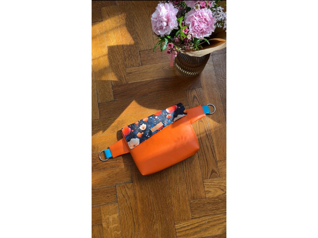 Ledvinka Noční louka je ušita z oranžové koženky, a nepromokavé látky na které se vyjímají barevné květiny na tmavém pozadí. Podšívka je ze 100% bavlny.
